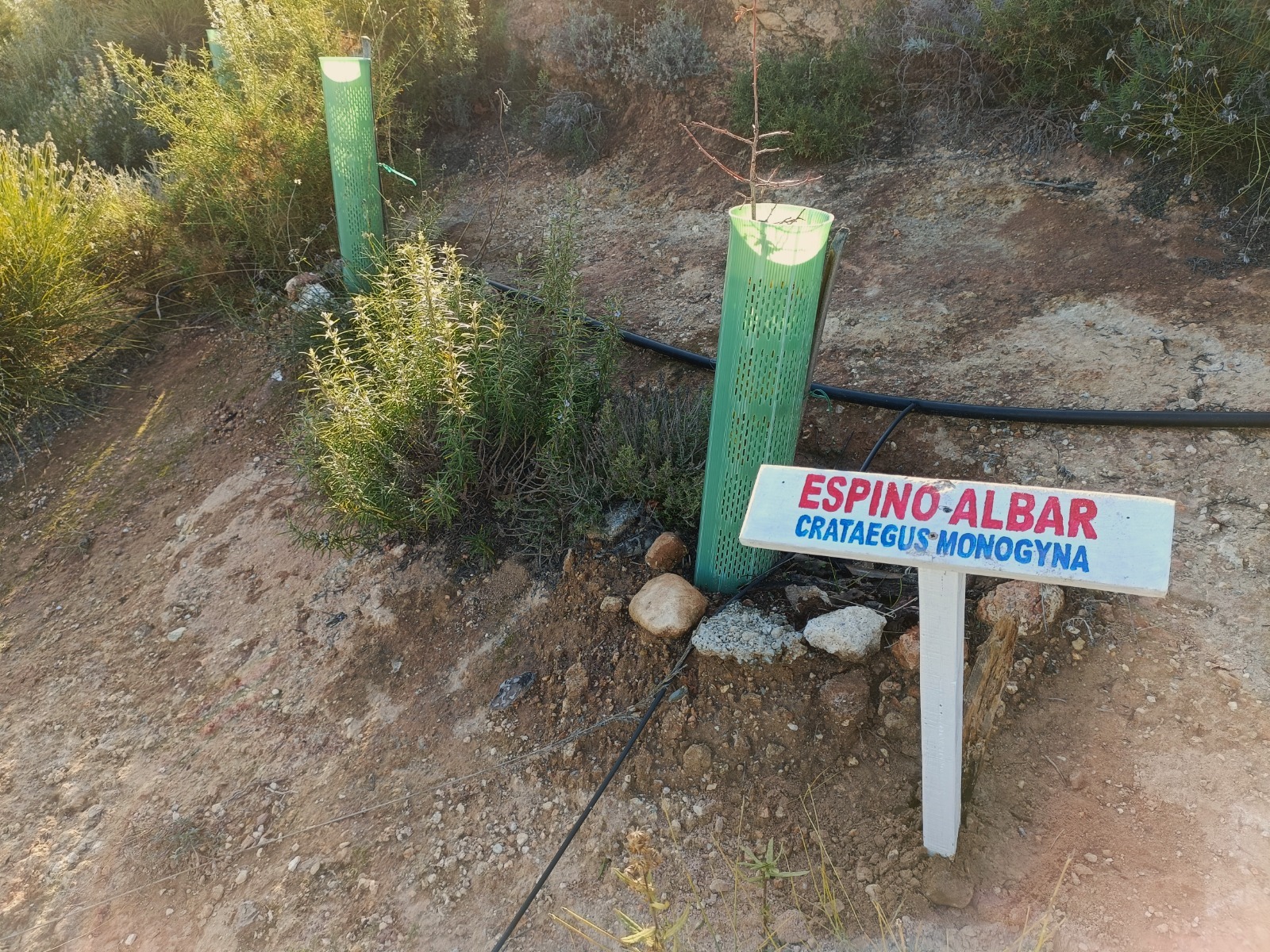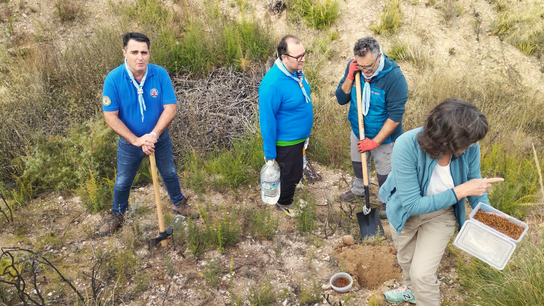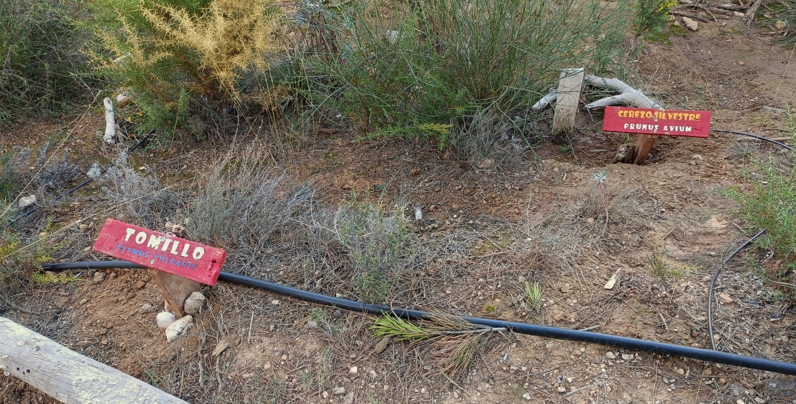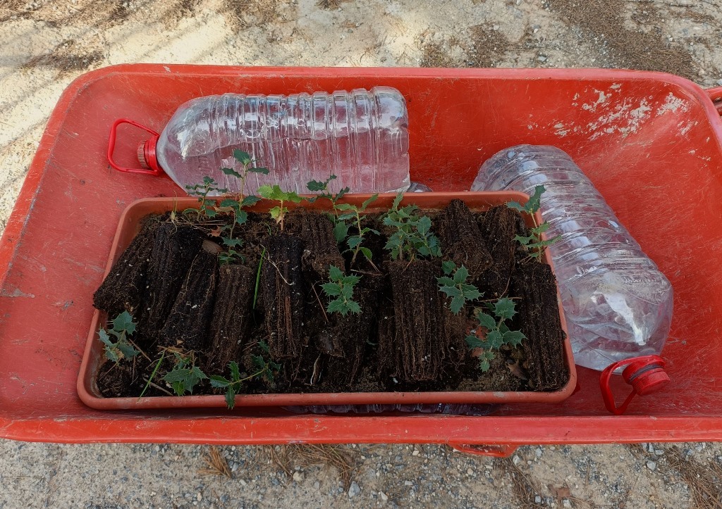 Tras varios días de reforestación en las inmediaciones de Vallescout, ahora tocaba seguir con las mejoras en nuestro jardín botánico del interior del campamento, en el que seguimos con la identificación de las plantas que van creciendo en su interior: un membrillo, álamo blanco, encinas, gayombas, retama, bolina, cornicabra, espinos, hediondas, lentiscos, tomillo, cerezos, rosales silvestres, aloes…, y un sinfín de plantas silvestres y aromáticas que embellecen este espacio natural.