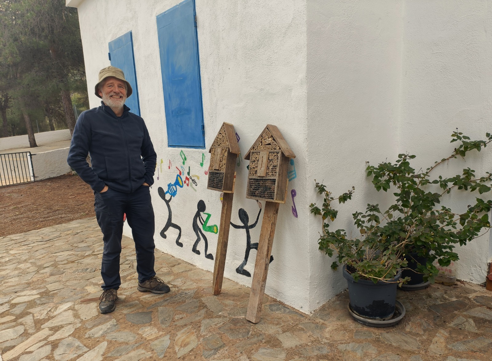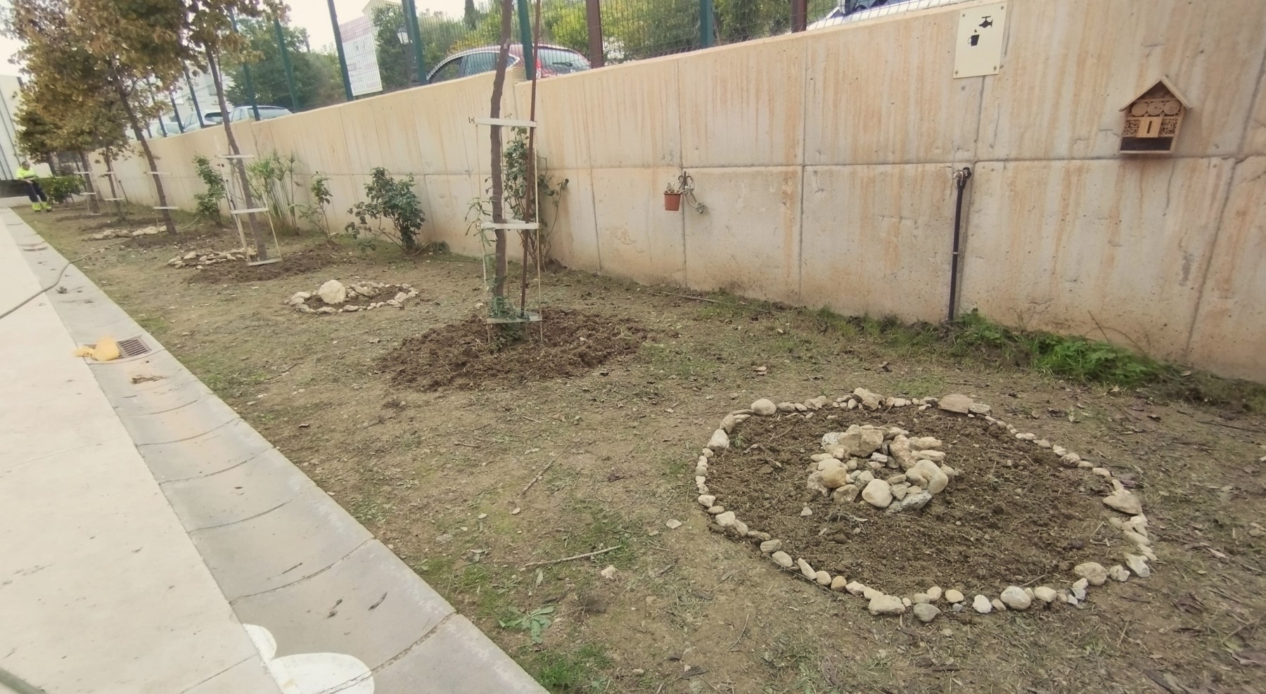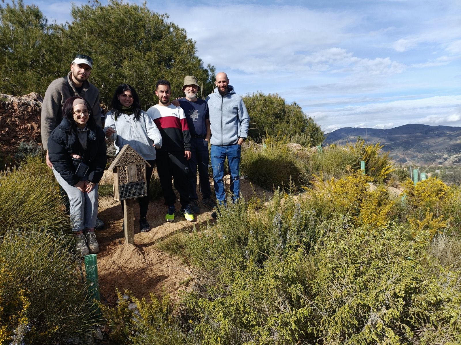 El día amaneció despejado y pudimos trabajar en el jardín botánico de VS que cada día va embelleciéndose con nuevas plantaciones, y con la colocación de dos hoteles de insectos donados por Jorge Villen y fabricados con material reciclado, que agranda su contenido didáctico para visitantes y campistas.